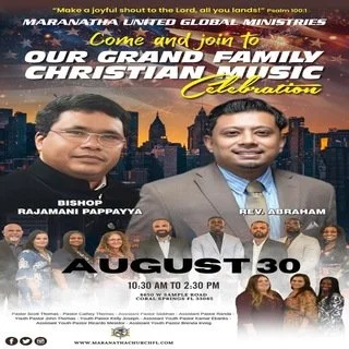 Maranatha United Global Ministries invites you to a powerful day of worship, praise, and fellowship at our Grand Family Christian Music Celebration. This exciting event will feature uplifting music, inspiring messages, and a spirit-filled atmosphere for everyone and their family.